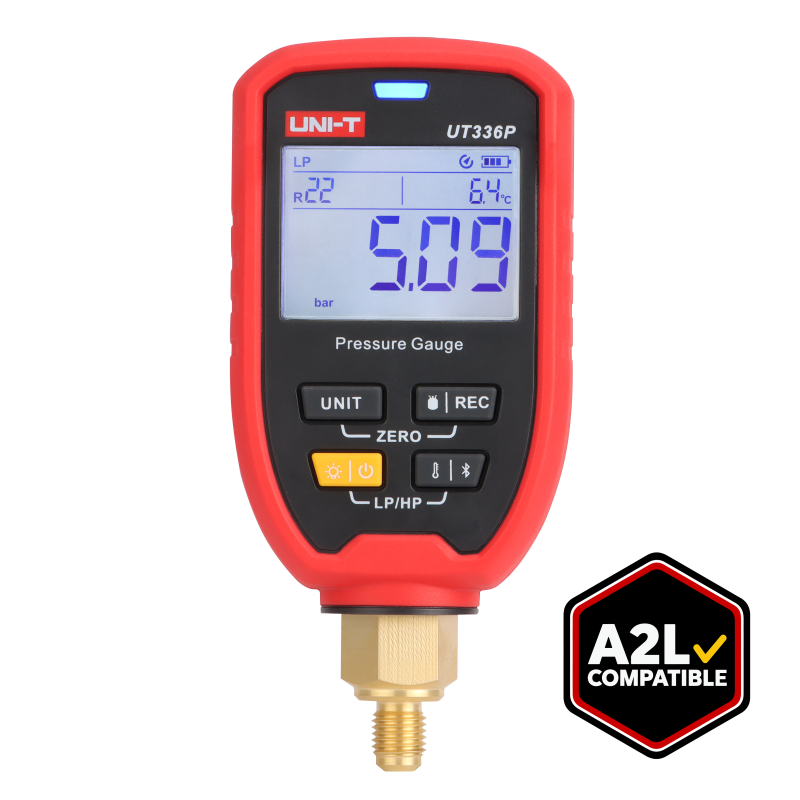 UT336P wireless pressure gauge is specifically designed for the installation, debugging, and maintenance of refrigeration and heat pump systems. It accurately measures system pressure and features offline data logging, supporting long-term real-time monitoring. The device is equipped with a 3.5mm temperature clamp interface, and when used with the UT-T19 temperature clamp, users can view key data such as high/low pressure refrigerant pipe temperature and superheat/subcooling on the app, ensuring efficient and stable system operation. It is suitable for a wide range of refrigeration and air conditioning applications.