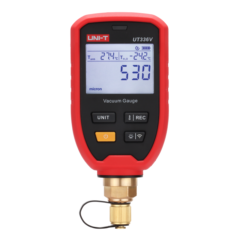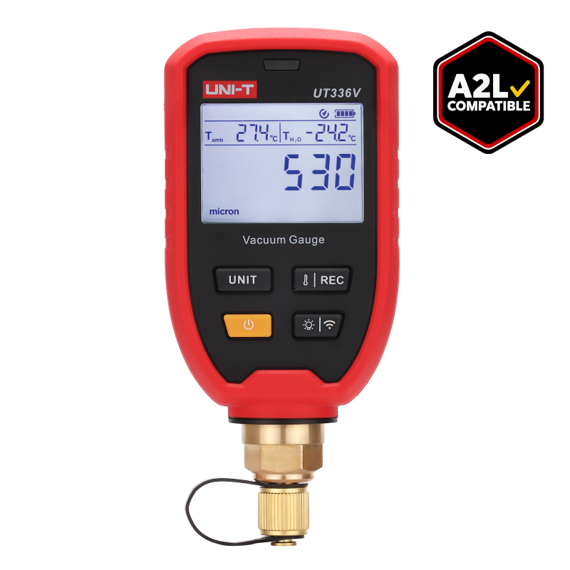 The UT336V is a compact, high-precision digital vacuum gauge with integrated Bluetooth, designed for critical measurement tasks in refrigeration and heat pump systems. It accurately monitors vacuum levels to verify system dehydration and cleanliness, making it an essential tool for installation, commissioning, and maintenance professionals who require reliable performance and wireless convenience in a portable device.